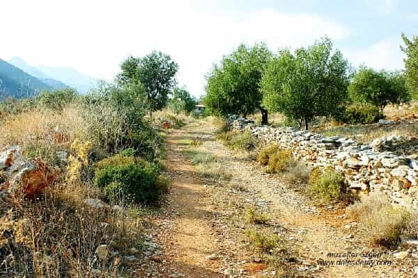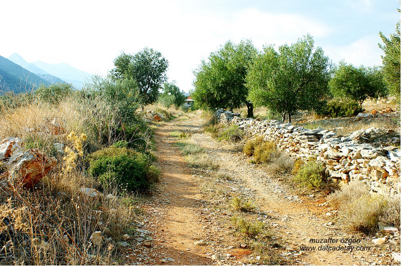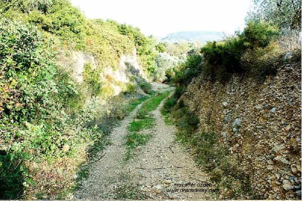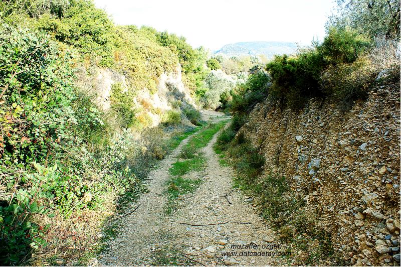 Zeytin ve badem ağaçlarıyla kaplı araziler, köprüye yaklaşırken antik yolun izleri kendini gösteriyor.