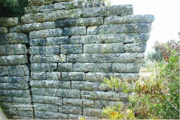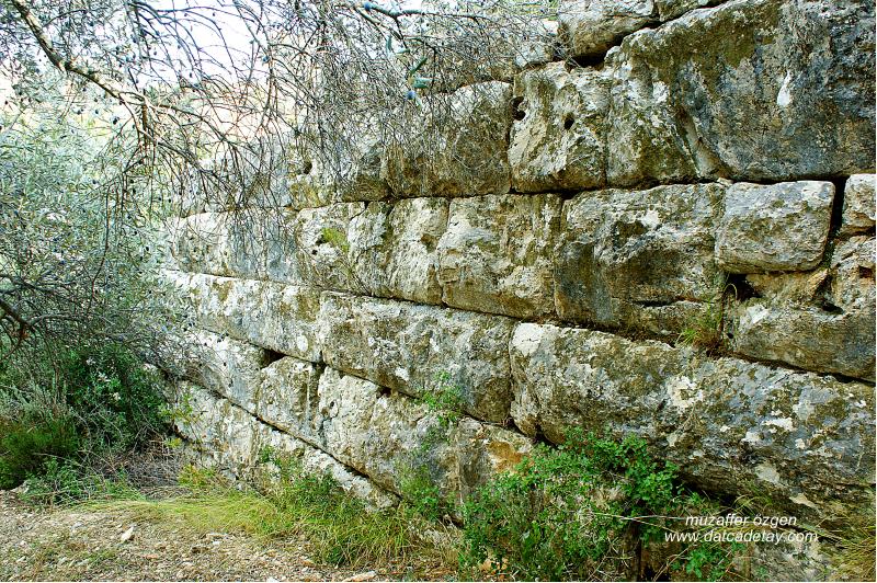 Köprünün kemere doğru giden dayanak duvarları. Köprü dere yatağını büyük taşlarla örülmüş duvarlardan bir yolla geçiyor. Dört metre genişliğe varan bu yolun üzerinde yürümek nasip olmadı her tarafını pinar çalıları kaplamış. Aslında yapı temizlenip gözler önüne serilebilinir. Sanki gizlenmek ister gibi maki bitkilerin içinde kalmış. 50 m ye yakın bir uzunlukta devasa taşlarla örülmüş yol, o devirlerde bu yolun önemini ortaya koyuyor.