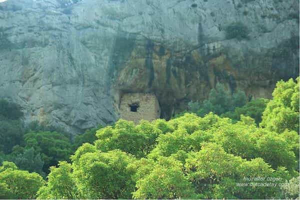 Kırlangıç yuvasına benzettiğim kadar yok mu, insanoğlu yaptığı bir çok şeyde doğadan esinlenmiştir. Yapı dip kısımlarından o kadar zarar gördüğü halde eğri biçimi ve kayalara tutunması sayesinde duruyor. Kavisli bir biçimde örülen duvar oyuğun tavanına tutturulmuş. Görünen kısım Batı tarafı, burada bir kapı ve küçük bir pencere varmış.
