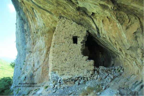 Yağmur sularıyla biçimlenmiş oyuğun içinde Kırlangıç yuvasını andırır küçük bir yapı. Renk olarak ta arkasındaki kayalarla uyumlu.